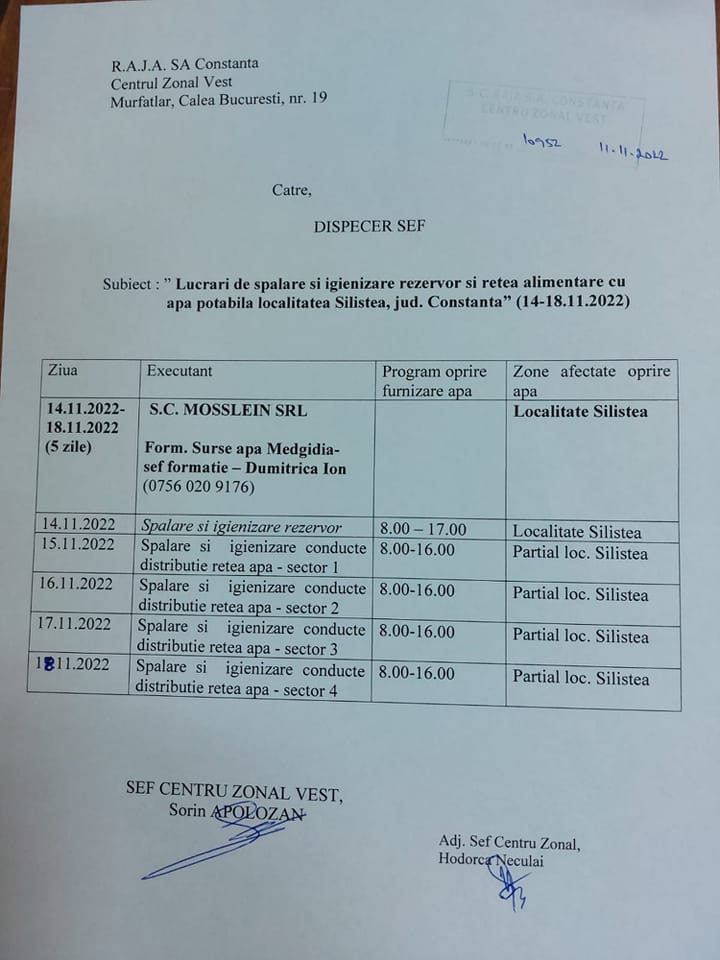 Luni – 14 noiembrie 2022, în intervalul orar 08.00 – 17.00, se va sista furnizarea apei potabile în localitatea Siliștea, județul Constanța, ca urmare a unor operațiuni de întreținere și igienizare la nivelul sistemului de alimentare cu apă din localitate.