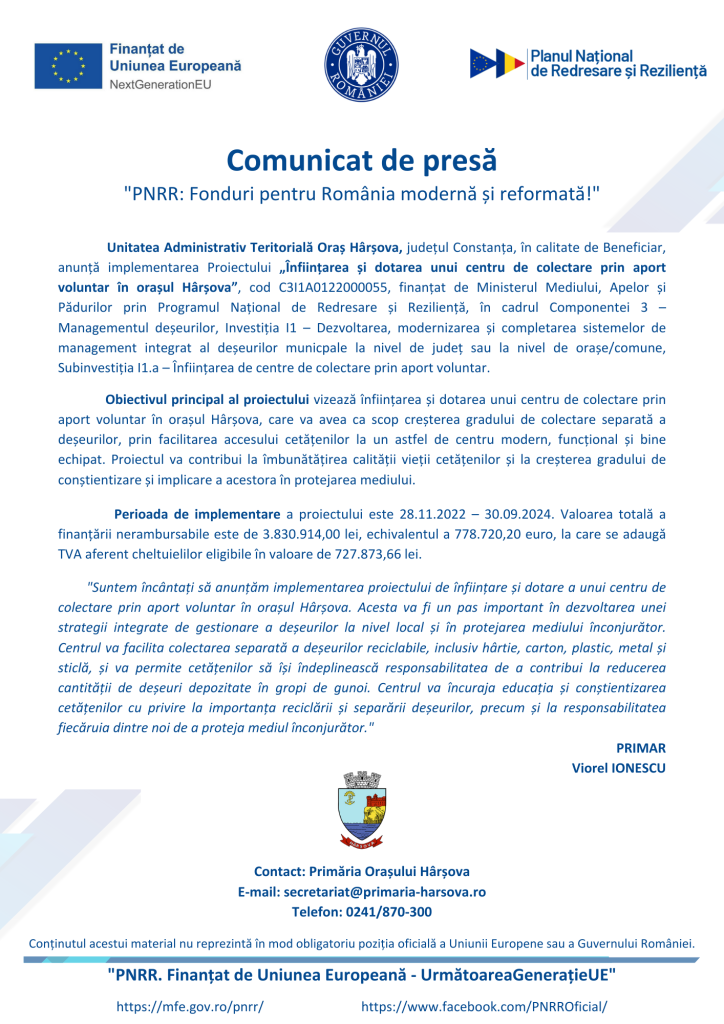 Primăria Hârșova – Implementare proiect “Înființarea și dotarea unui centru de colectare prin aport voluntar în orașul Hârșova”
