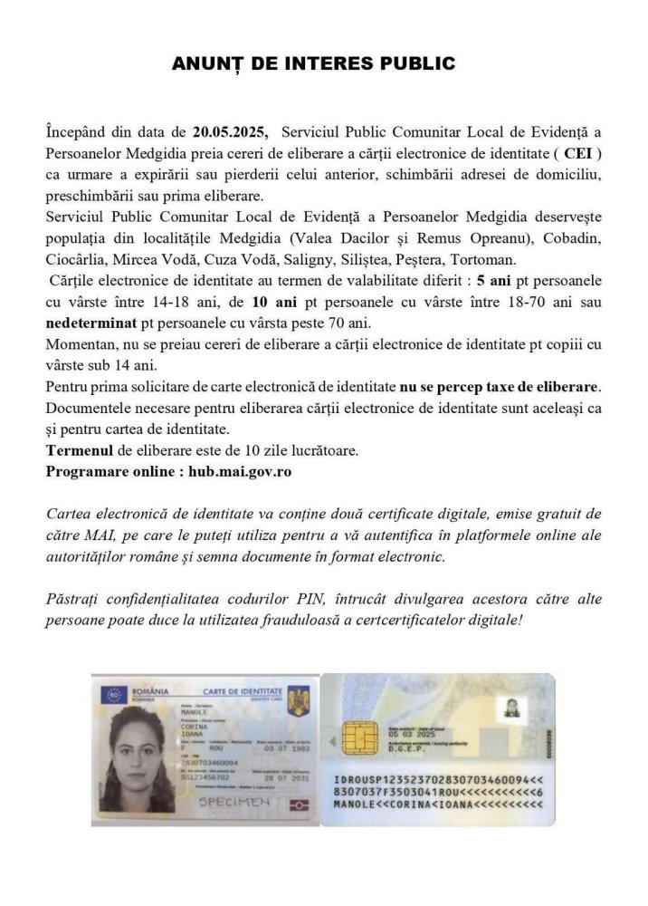 Începând din data de 20.05.2025, Serviciul Public Comunitar Local de Evidență a Persoanelor Medgidia preia cereri de eliberare a cărții electronice de identitate (CEI) ca urmare a expirării sau pierderii celui anterior, schimbării adresei de domiciliu, preschimbării sau prima eliberare.