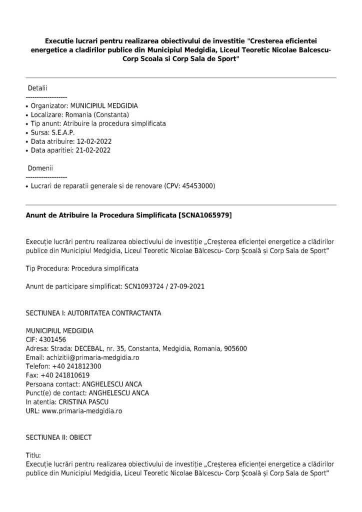 Primăria Municipiului Medgidia, județul Constanța a organizat o licitație pentru achiziția serviciilor de execuție lucrări, pentru realizarea obiectivului de investiție „Creșterea eficienței energetice a clădirilor publice din Municipiul Medgidia, Liceul Teoretic Nicolae Balcescu – corp școală și corp sală de sport”.