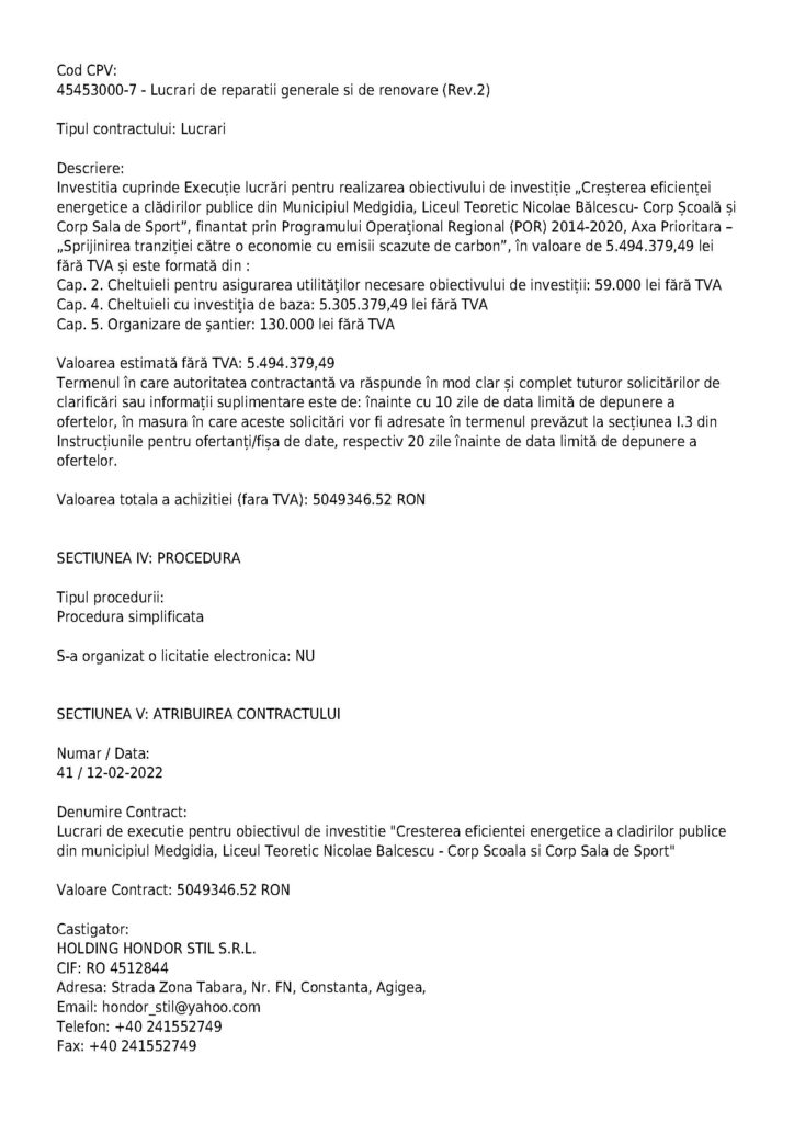 Valoarea totală a contractului este de 5.049.346,52 lei, iar societatea comercială câștigătoare este HOLDING HONDOR STIL S.R.L.
