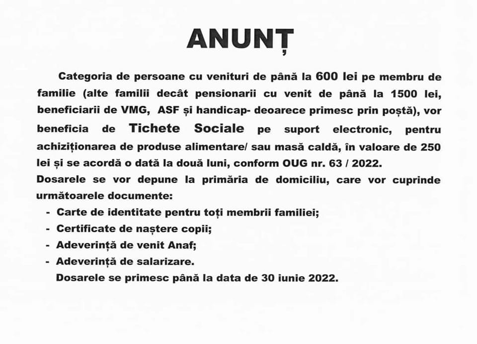 Primăria Saraiu ne informeaza că dosarele pentru Tichetele Sociale se depun la PRIMĂRIA COMUNEI SARAIU, până pe data de 30 iunie 2022
