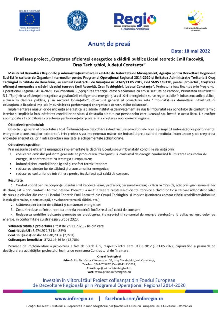 Primăria Techirghiol – Informare proiect ”Creșterea eficienței energetice a clădirii publice Liceul teoretic Emil Racoviță“