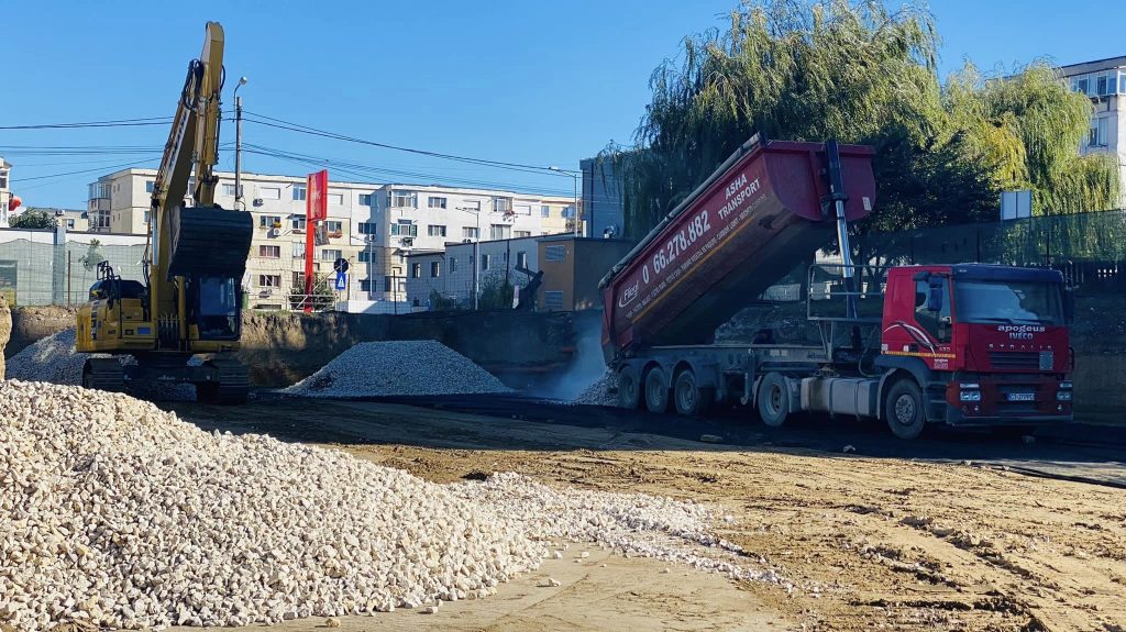Santierul de lucrări de la noua Școală nr.3: zeci de camioane încărcate cu piatră făceau rând la descărcare. Fundația noii